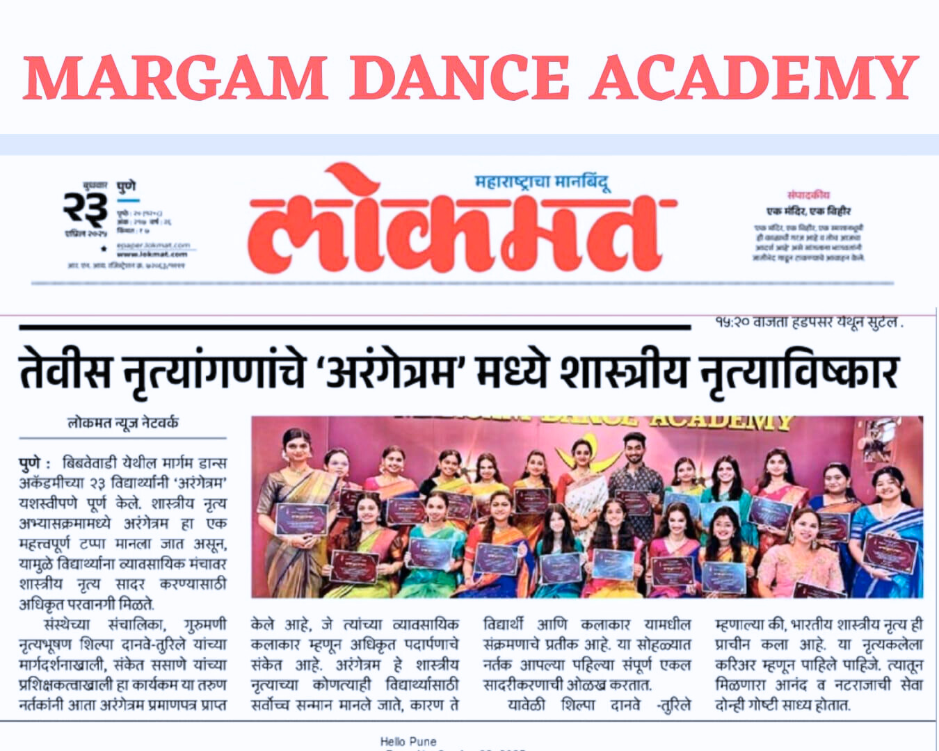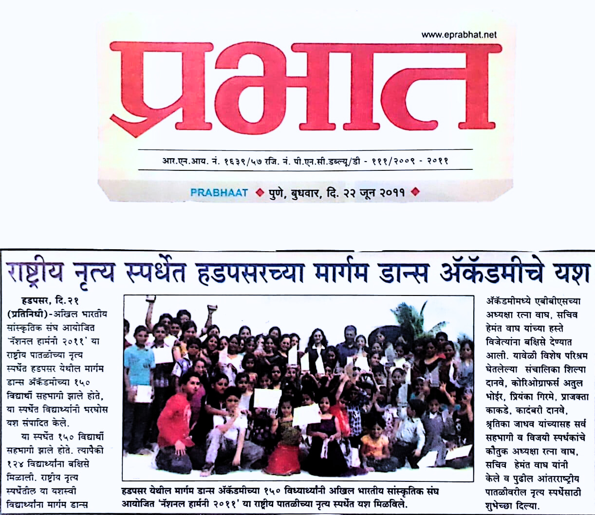 The news reports that students from Margam Dance Academy in Hadapsar achieved great success at the national dance competition “national harmony 2011,” organized by the Akhil Bharatiya Sanskrutik Sangh. Around 150 students participated and won several prizes, bringing pride to the academy.